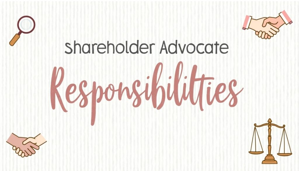 Responsibilities of a shareholder advocate include communicating with shareholders, attending meetings, analyzing company performance, and pushing for changes that benefit shareholders.